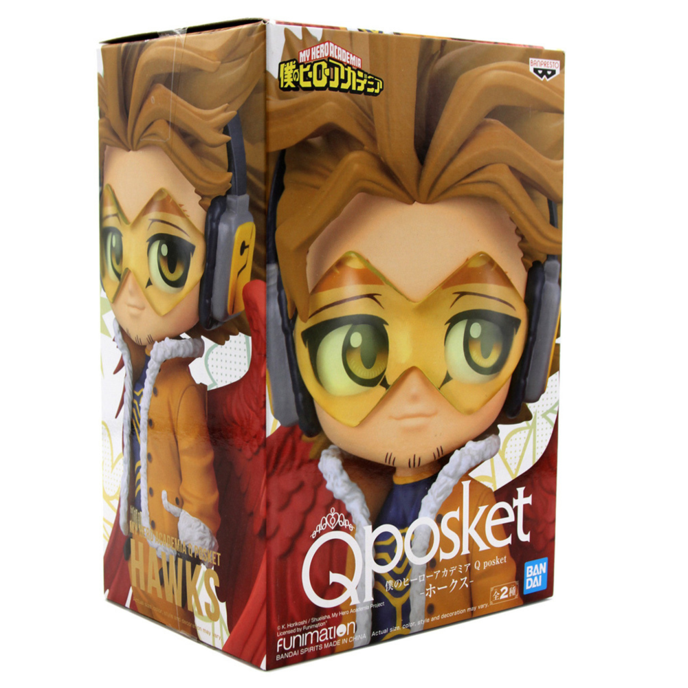Figure Hawks Ver. A da franquia My Hero Academia, produzida pela Banpresto na linha Qposket. Feita em PVC-ABS, esta peça de 14 cm traz o herói alado em um visual detalhado e cheio de carisma. Um item indispensável para colecionadores e fãs do universo dos heróis!